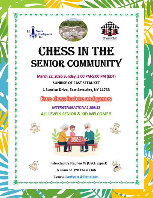 March 17 (Tue), 2026, 6:30pm ~ 8:30pmChess Workshop in the Senior Community