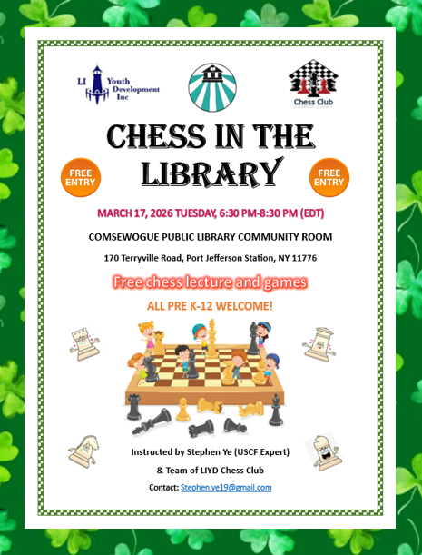 March 10 (Tue), 2026, 7:30pm ~ 9:00pmChess Workshop in the Library